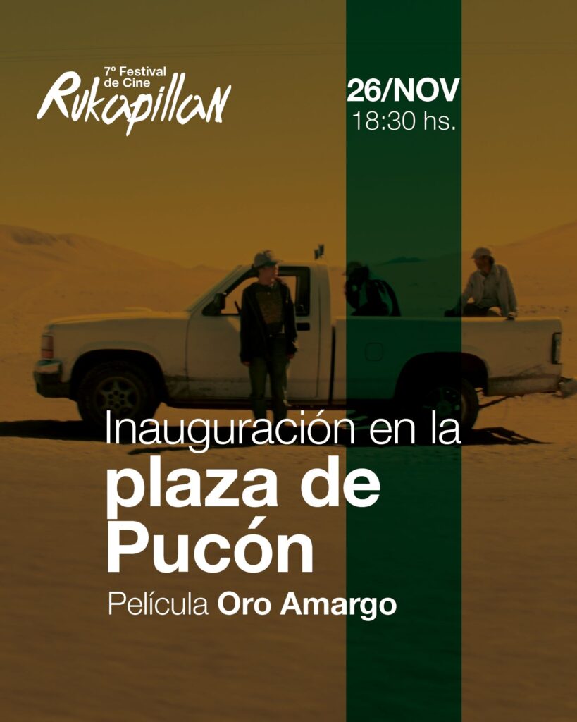 Pucón, 20 de noviembre de 2025.– El 7º Festival de Cine Rukapillan dará inicio a su programación el miércoles 26 de noviembre a las 18:30 horas con un evento abierto a toda la comunidad en la plaza de Pucón, donde se exhibirá el largometraje “Oro amargo”, del director Juan Francisco Olea. La ceremonia de inauguración comenzará al atardecer e invita a vecinos, vecinas y visitantes a reunirse en el centro de la ciudad para vivir una experiencia cinematográfica bajo el volcán.
